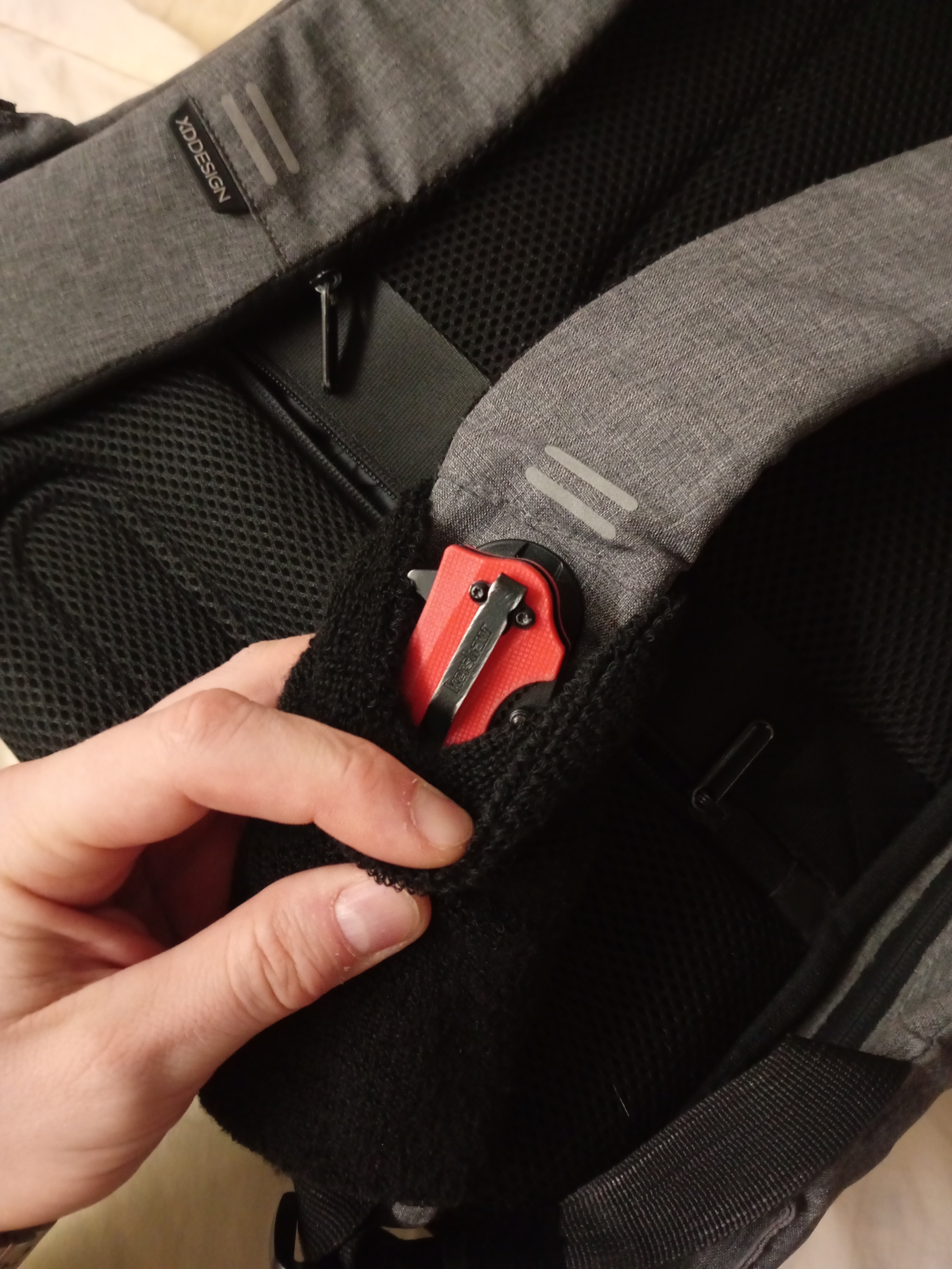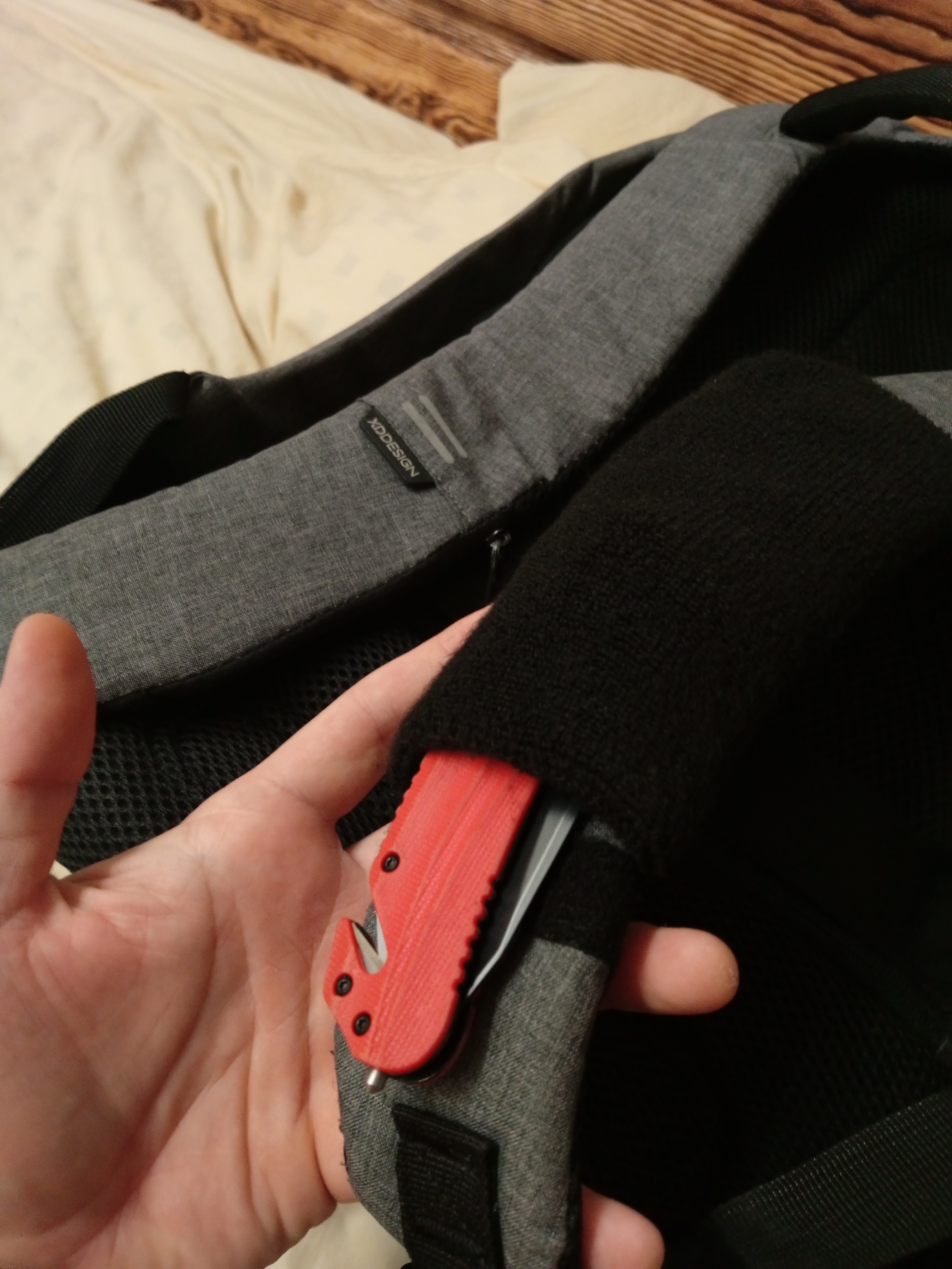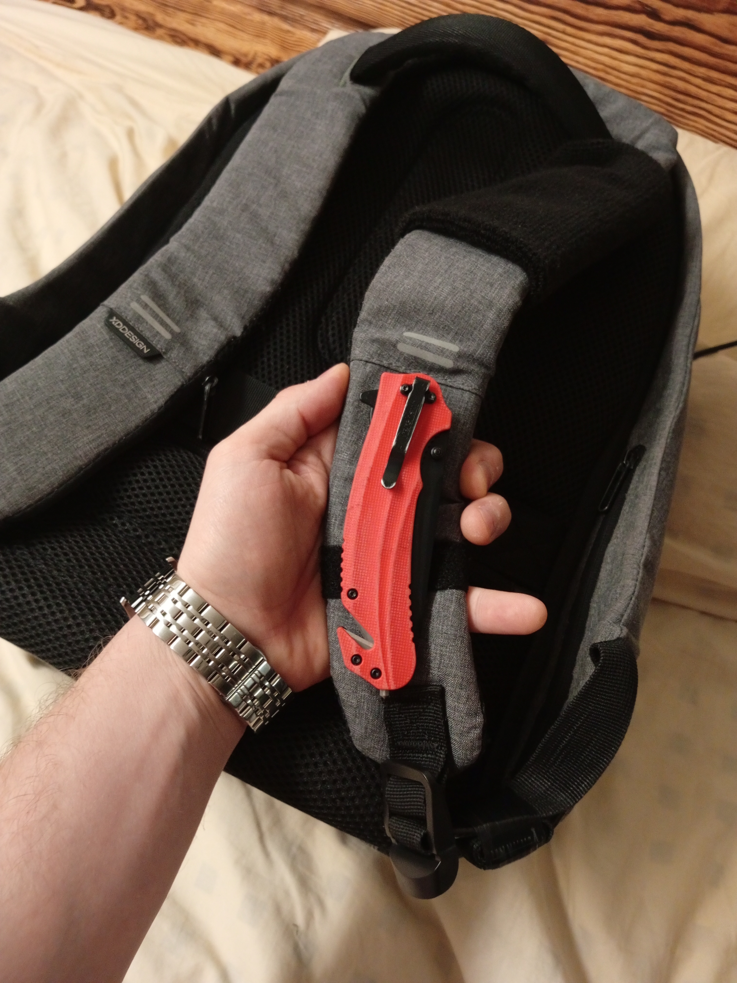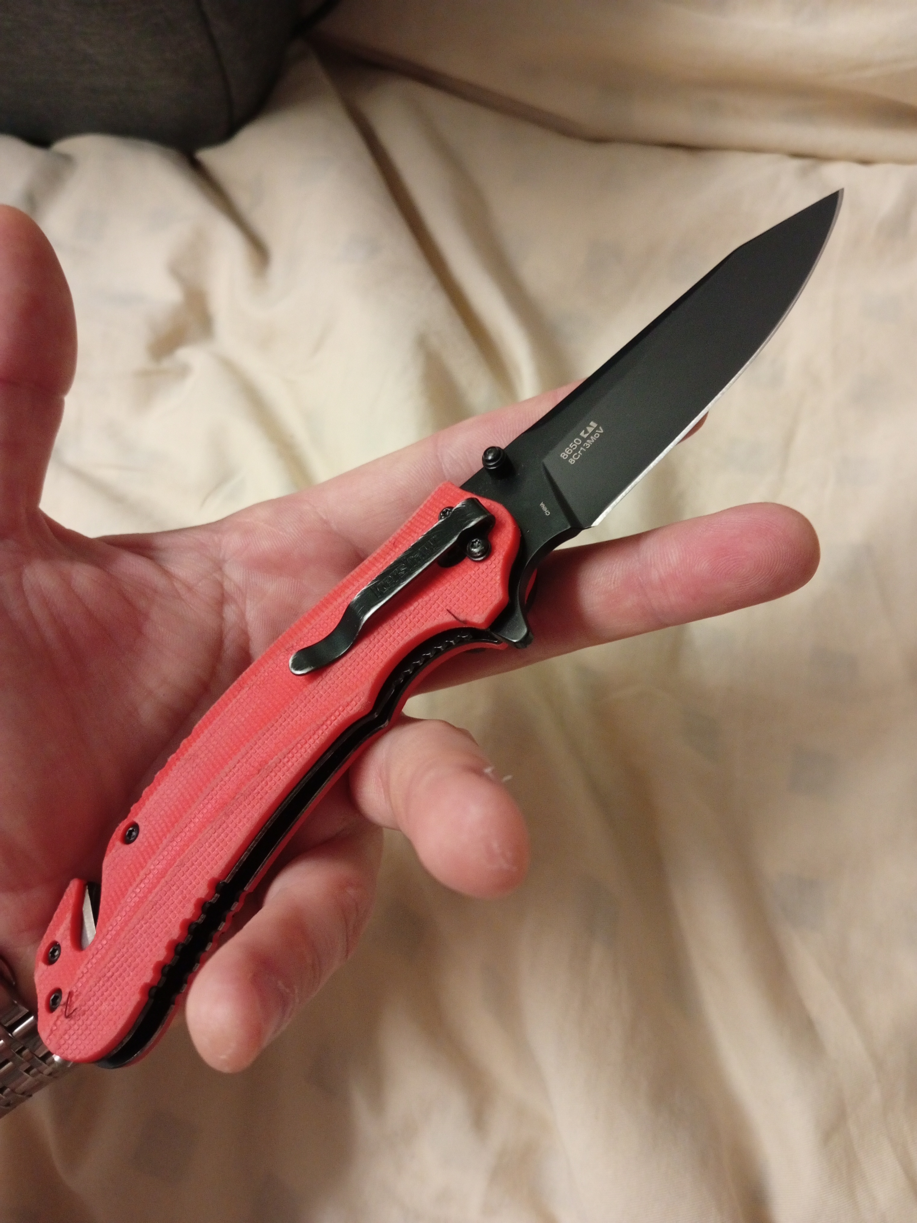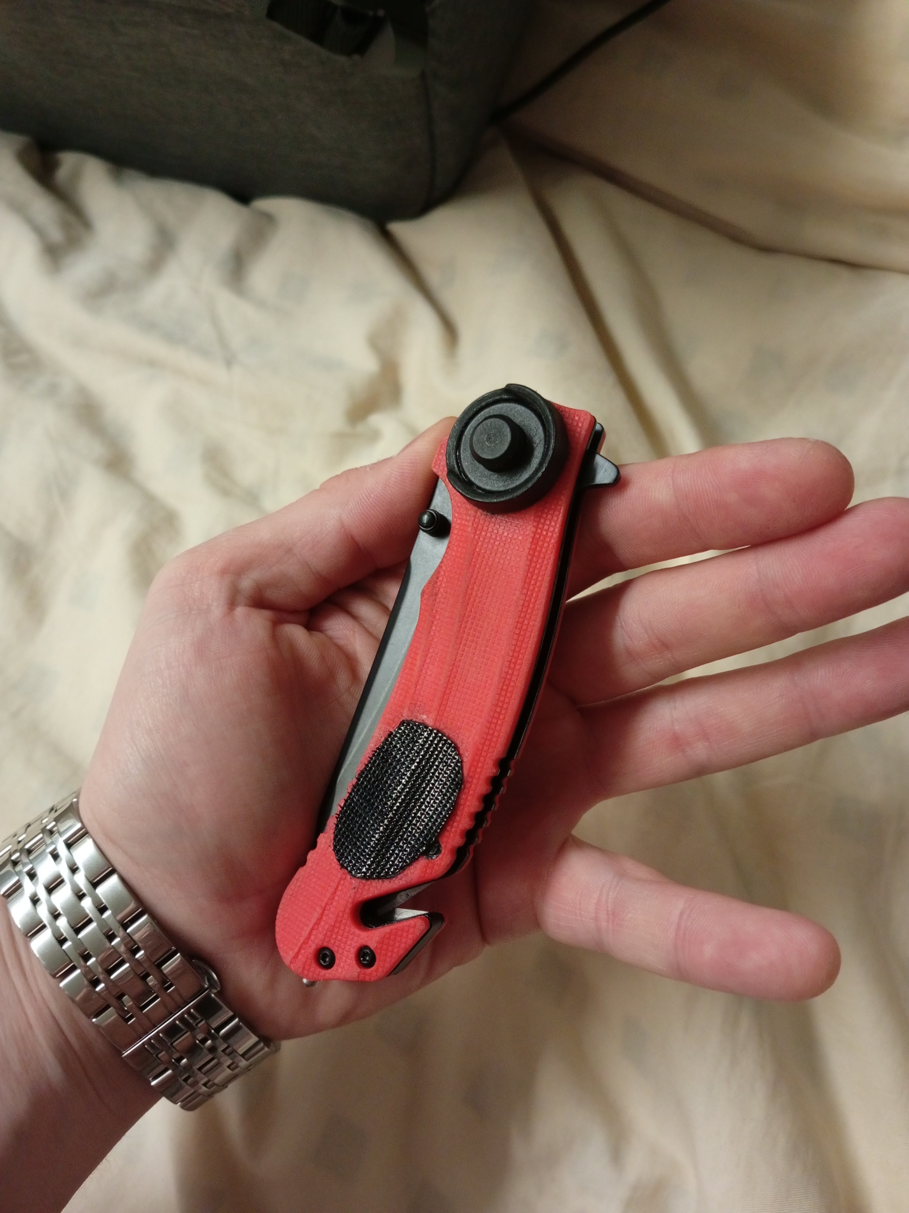 Выбирал нож для постоянного ношения и использования на работе(стройка), в быту, природе, рыбалке и в лесу. Как раз искал яркий дизайн для заметности на случай утери. Подошёл идеально. Хват удобный, раскладывать за плавник очень удобно, пружина хорошая, раскрывает нож без осечек. А вот шпенёк на клинке маловат, палец так и хочет соскользнуть на клинок((( Стеклобой работает, стекло бьёт, по твердости даже легко царапает стекло смартфона. Стропорез также рабочий, шнуры и веревки режет на раз, а вот с ремнями или стропами нужно приловчиться. Доработал для удобства ношения на рюкзаке и сразу же убрал идеальность внешнего вида "состарив" шкуркой до состояния рабочего инструмента. Нож - это в первую очередь инструмент, а не сувенир)